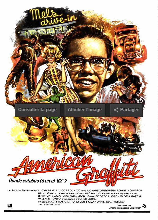 Film américain du réalisateur Georges Lucas, Américan Graffiti est sorti en 1973. Dans le film, les rôles principaux sont tenus par Richard Dreyfuss, Ron Howard, Paul Le Mat, Charles Martin Smith, Candy Clark, Mackenzie Phillips, Cindy Williams.